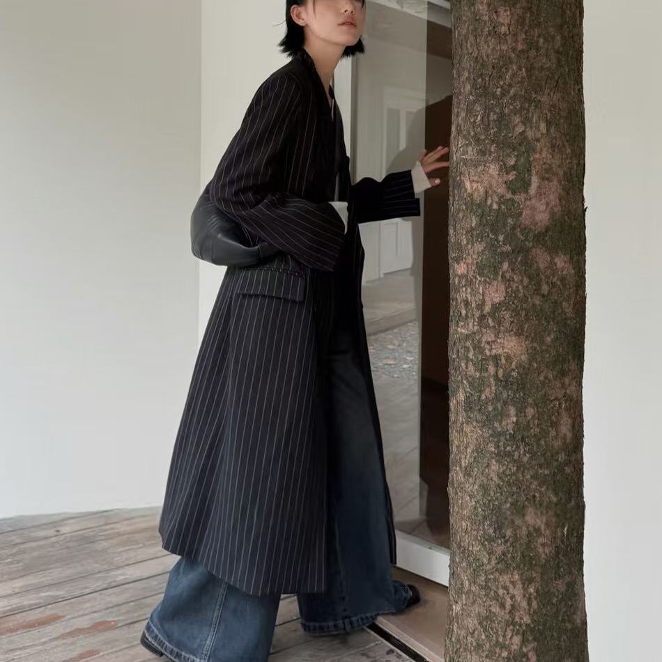 Women's Pinstripe Double - Breasted Longline Blazer Coat, Oversized Lapel Trench Jacket for Elegant Commute