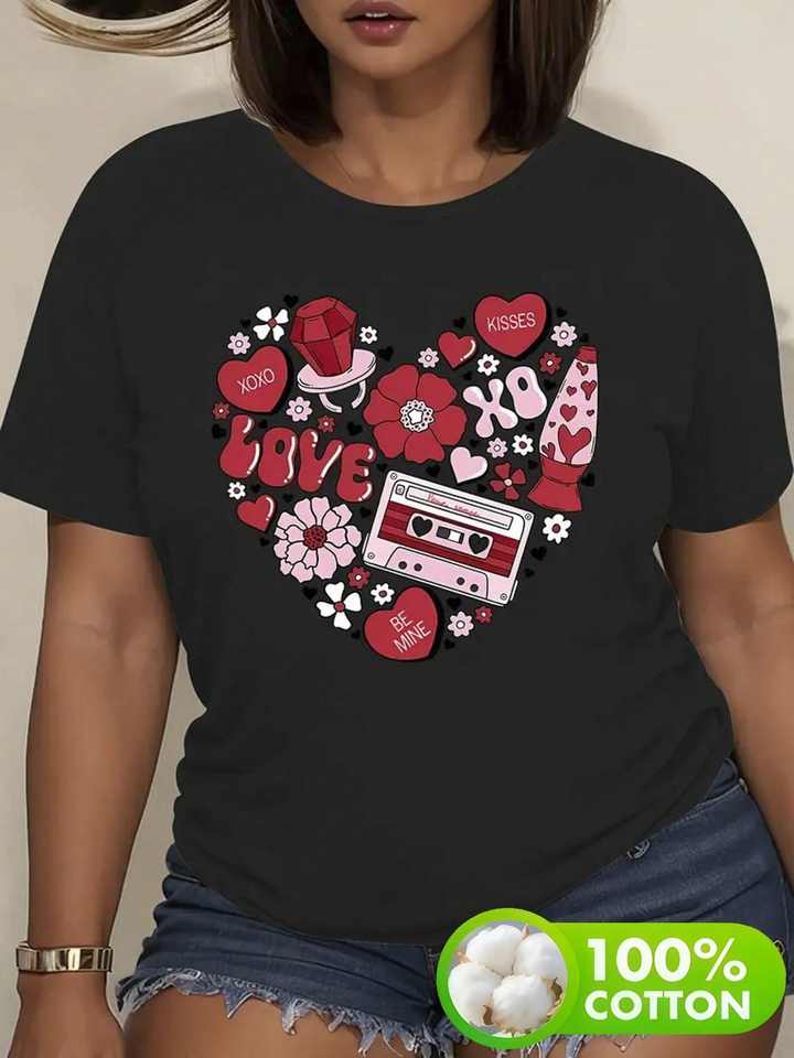 T-shirt da donna taglie forti stile retrò anni '80 per San Valentino, nera a maniche corte con scollo rotondo e stampa cuore rosso XOXO, in morbido cotone casual