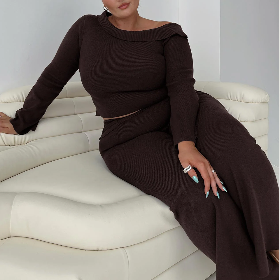 Pantaloni a Zampa in Maglia a Coste Marrone Taglie Forti da Donna, Pantaloni Casual a Vita Alta, Set Coordinato, Abbigliamento Caldo per Autunno e Inverno
