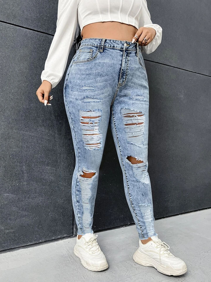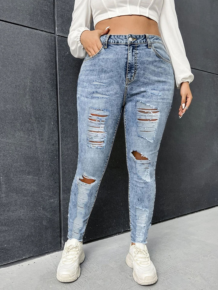 Jeans Skinny Strappati da Donna Taglie Forti a Vita Media in Denim Elasticizzato Effetto Usurato con Dettagli Strappati Poliestere/Cotone