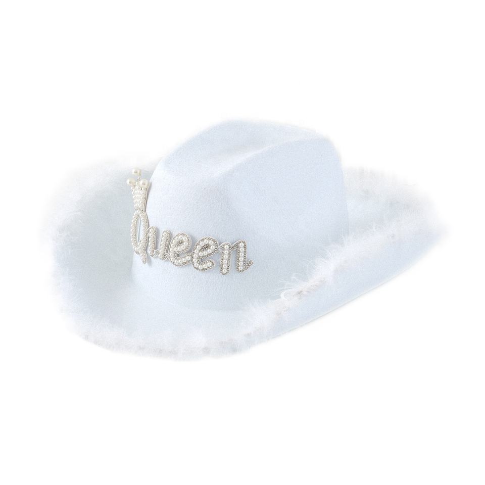 Women's Queen Crown Cowboy Hat with White Pink Feather Birthday Hen & Bachelorette Party Wear for Travel & Fishing