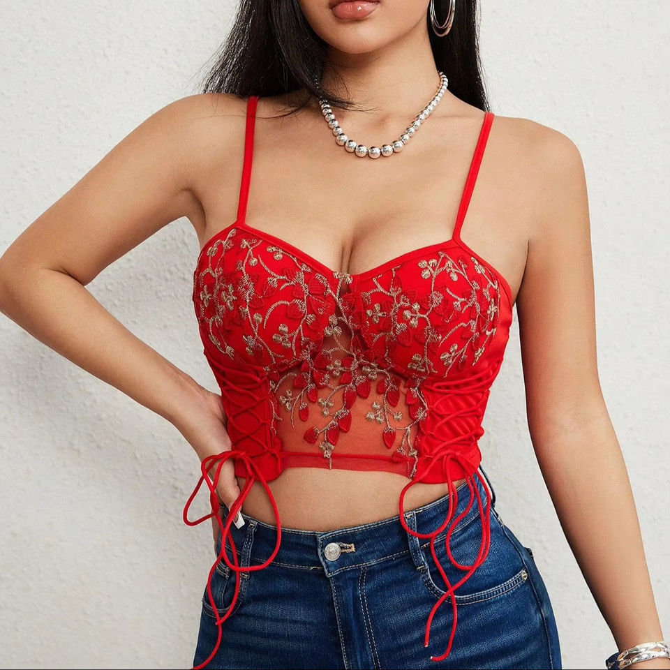 Women's Red Pink Black Purple White Floral Lace Cami Crop Top Spaghetti Strap Sheer Mesh Corset Bustier Halter Tops Bralette