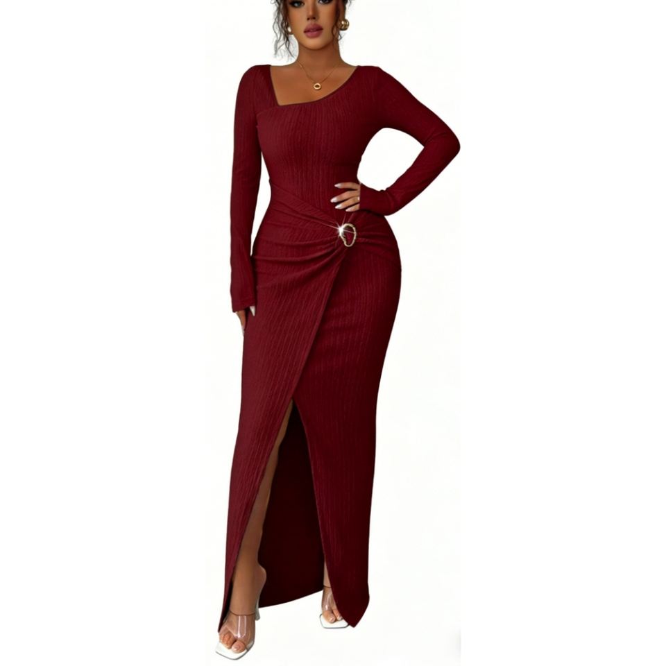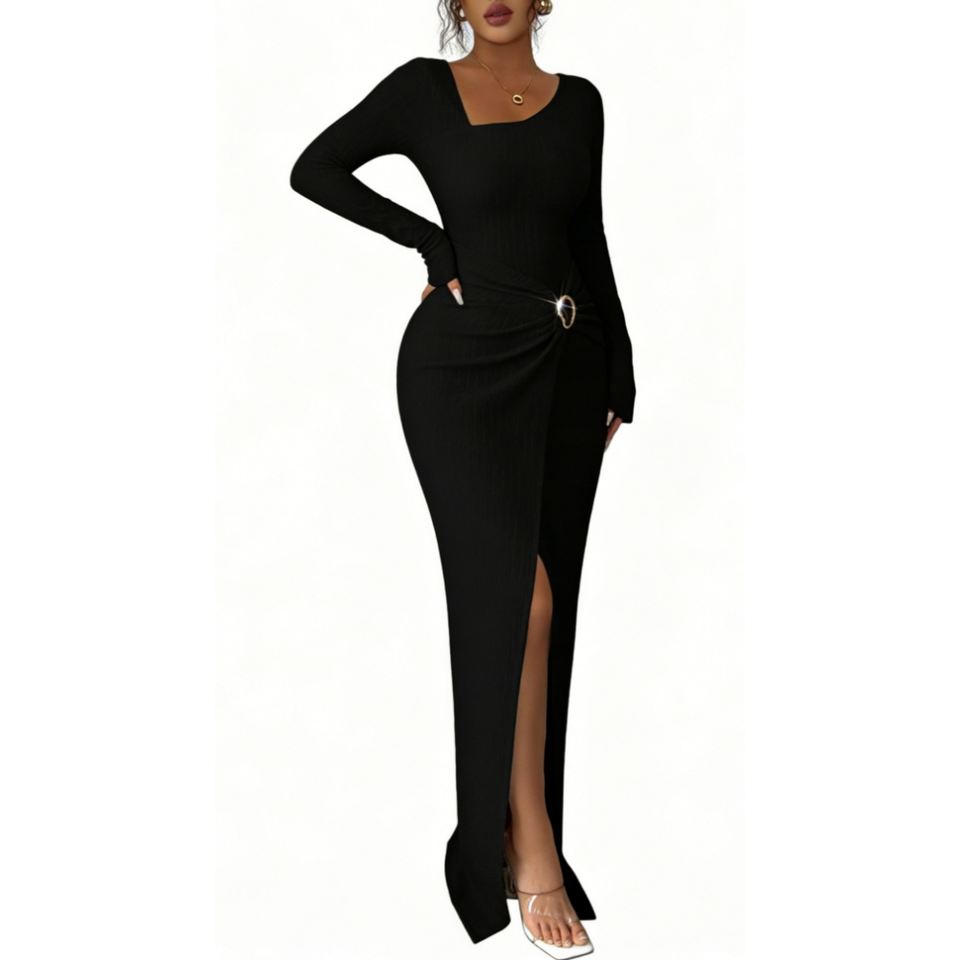 Abito Lungo a Coste da Donna - Elegante Vestito Aderente a Maniche Lunghe con Spacco Laterale e Dettaglio Annodato Sehe Fashion