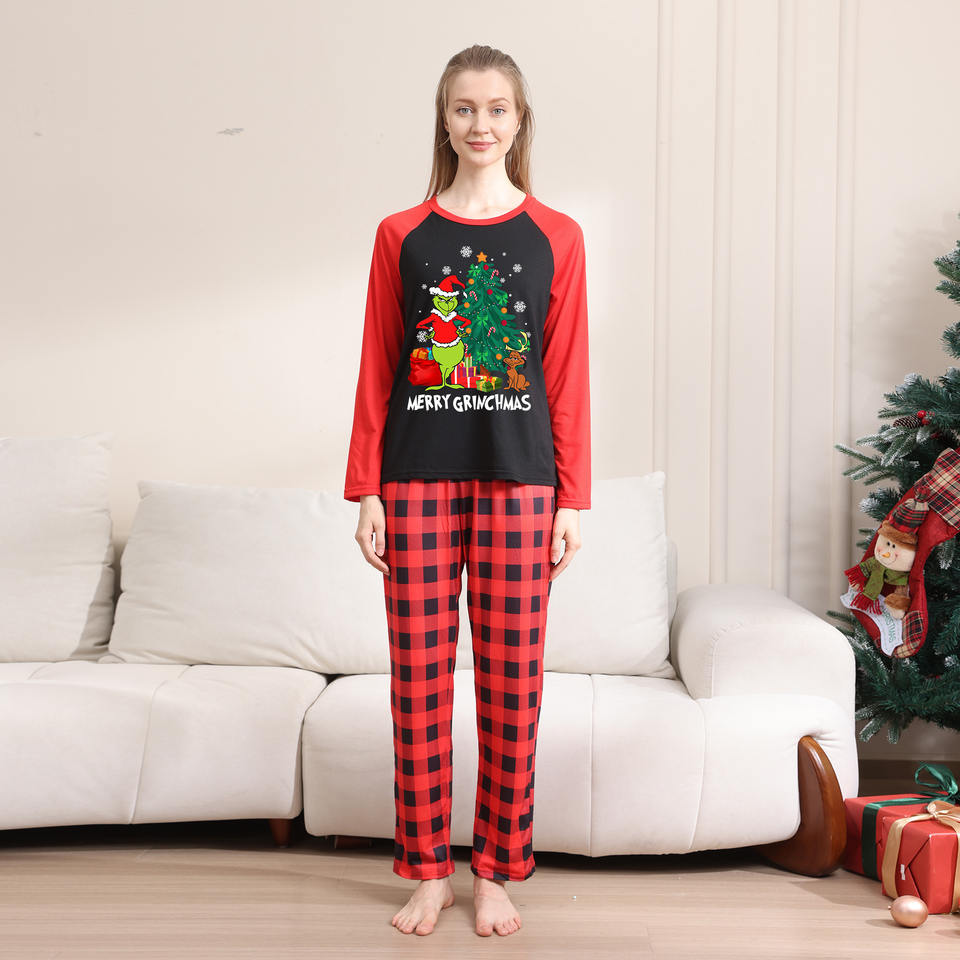 Women's Santa Claus Print Christmas Pajamas Set Red Plaid Long Sleeve Loungewear Outfit for Summer for Holiday Autumn Spring