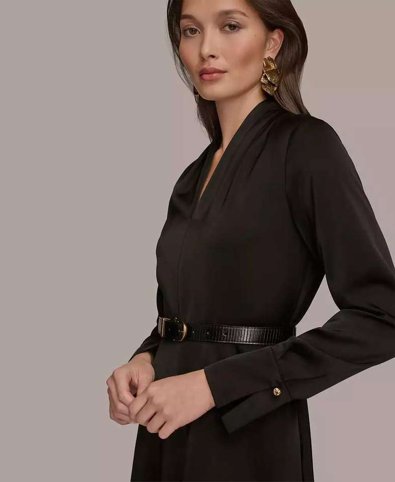 Abito Midi con scollo a V in raso con cintura a-line | Donna Karan New York