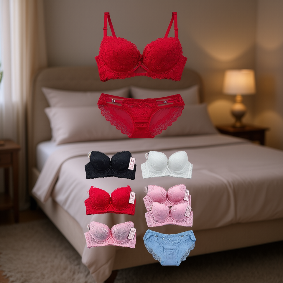 Women's Sexy Lace Push-Up Bra And Panty Set In Red Black White Pink Blue - Semi-Sheer Lingerie Underwear With Fixed Chest Pads,