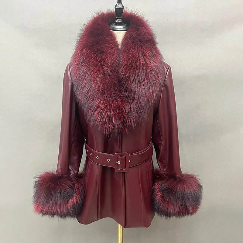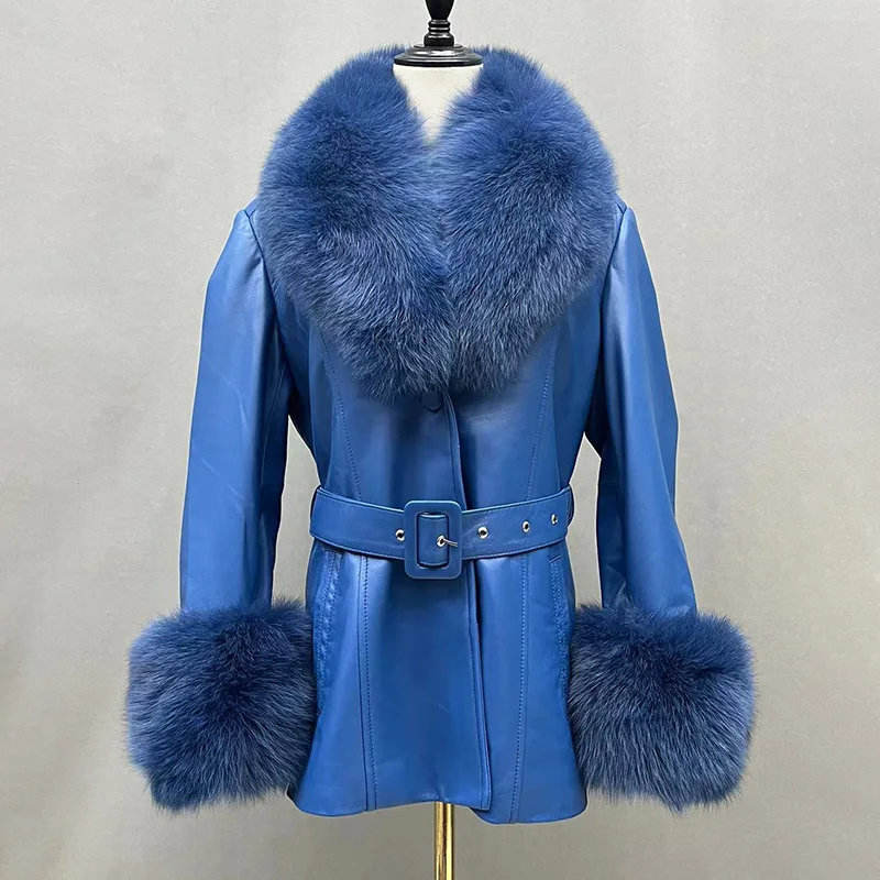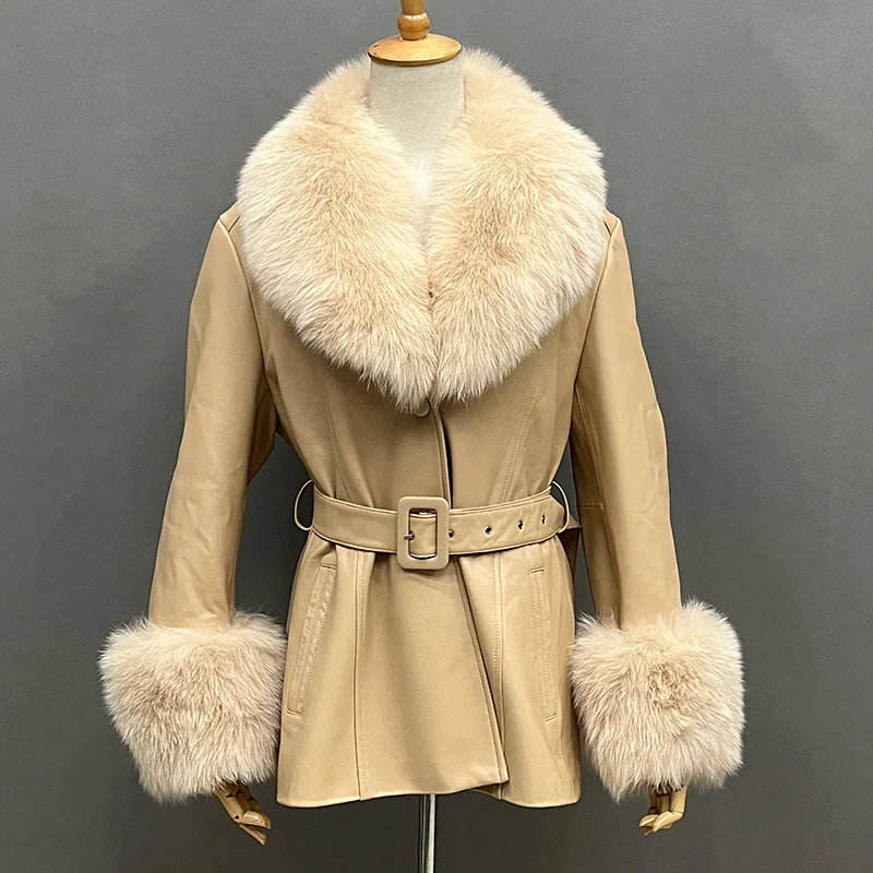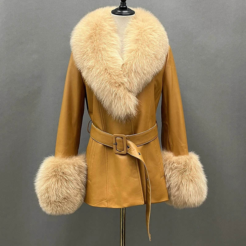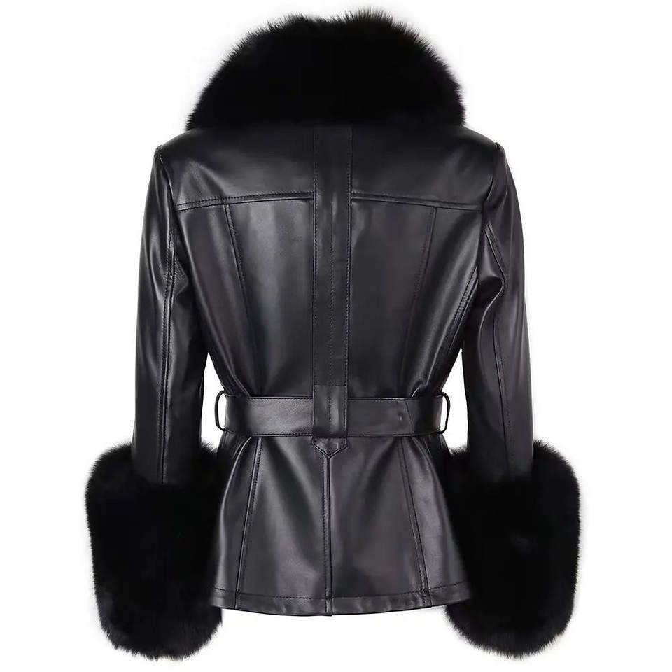 Women's Sheepskin Leather Jacket With Fox Fur Collar and Cuffs