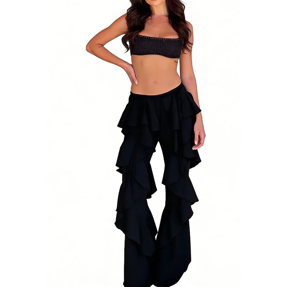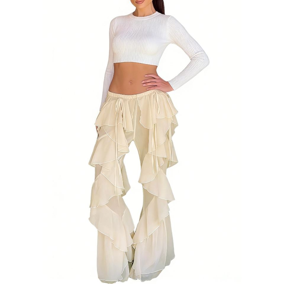 Pantaloni a Zampa con Volant in Rete Trasparente da Donna, Stile Boho con Dettaglio a Strati e Laccetti, Copricostume da Spiaggia, Abbigliamento Femminile Sehe Fashion