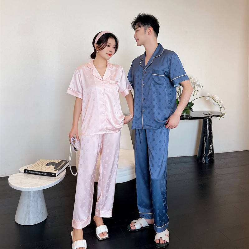 Women's Silk Pajamas Short Sleeve Couple Nightgown Solid Color Jacquard Cartoon Home Wear Men's Satin Plus Size Sleepwear