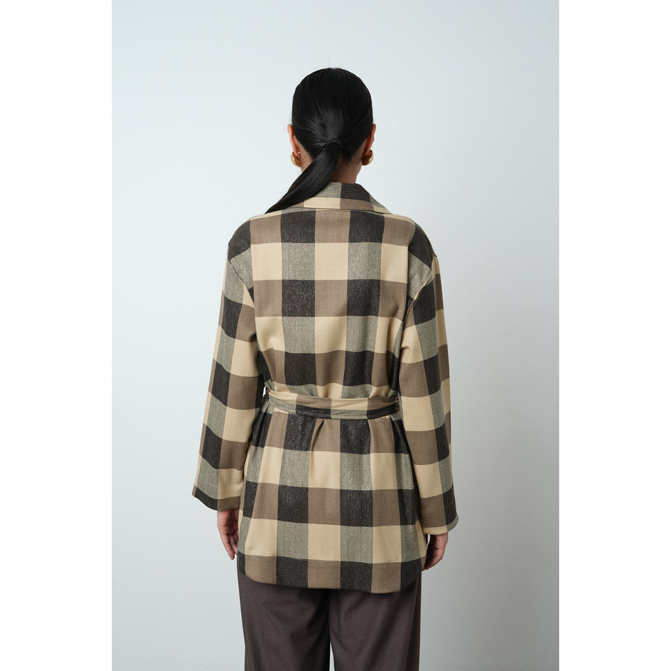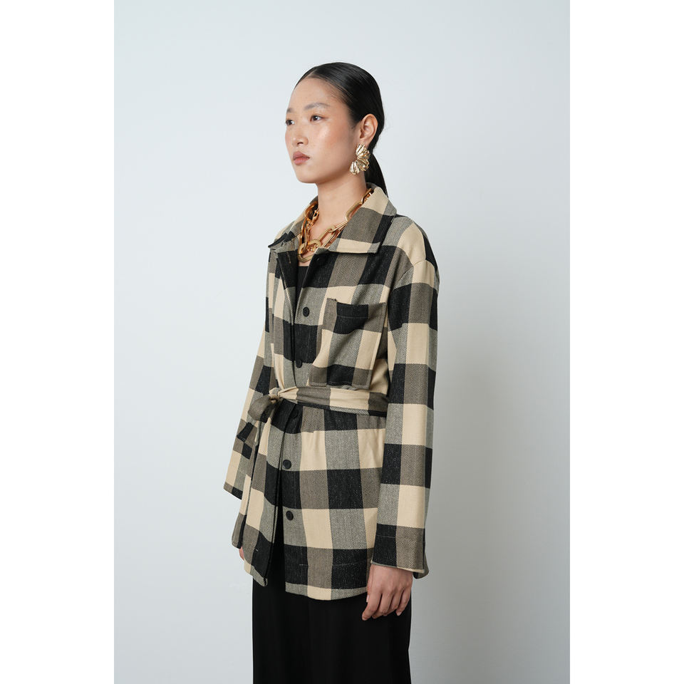 Women's Single Pocket Belted Plaid Patterned Jacket Hijab Shirt