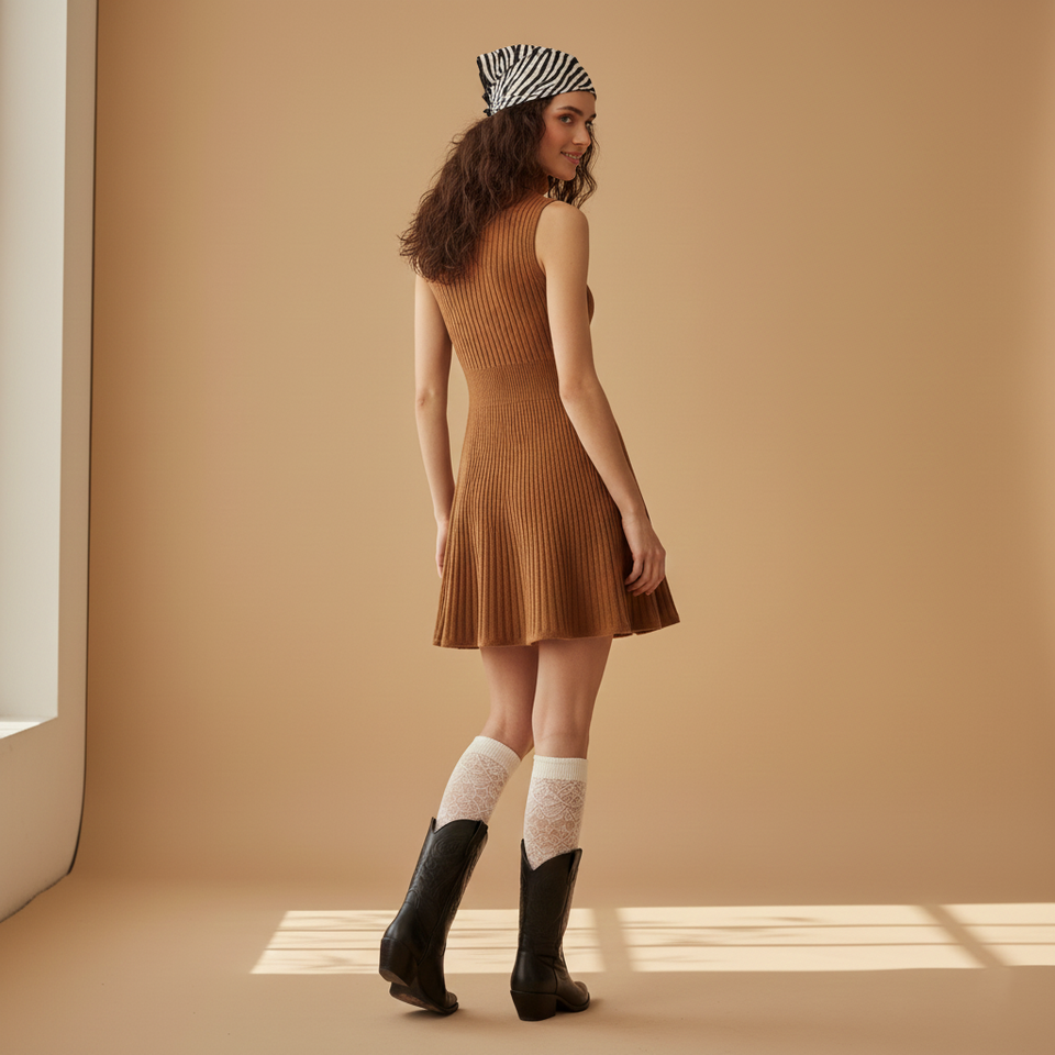 Women's Sleeveless Knit Wool Casual Winter Simple Turtleneck Ribbed Dress & Flared A-Line Mini Skirt 12GG
