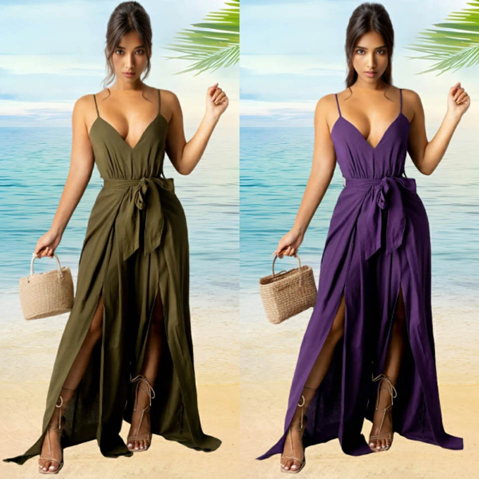Tuta Intera Senza Maniche da Donna con Spacco Lungo e Fiocco, Logo Personalizzabile, Vestibilità Ampia, Vita Alta, Fitness, ODM, Estiva, Stampa Fantasia, per Vacanze