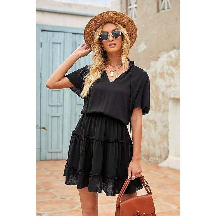 Mini Abito Estivo Casual da Donna, Linea A, Nero in Chiffon con Scollo a V e Maniche Corte Arricciate