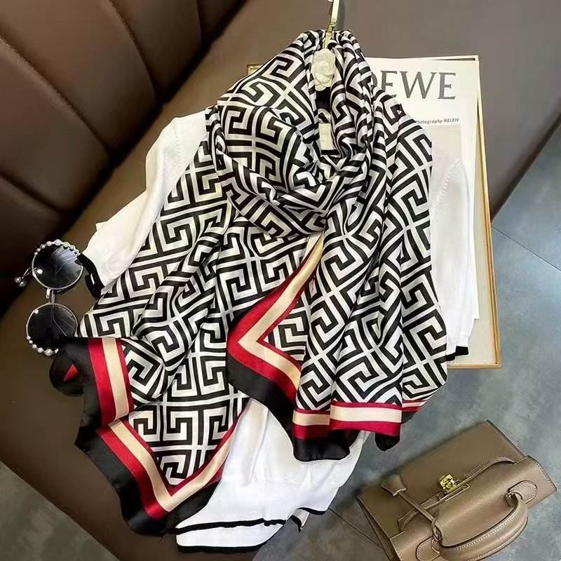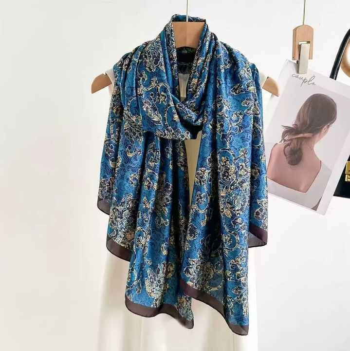 Sciarpa da donna con stampa floreale in poliestere morbida in nero e blu per la copertura da spiaggia primavera estate e involucri per la protezione solare