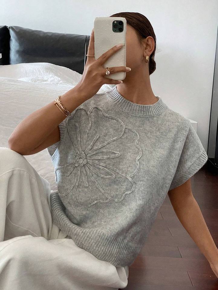Women's Solid Color Knit Casual Sweater, Simple and Stylish for Everyday Wear Pure Gray Handmade Patterned Floral Knit Top