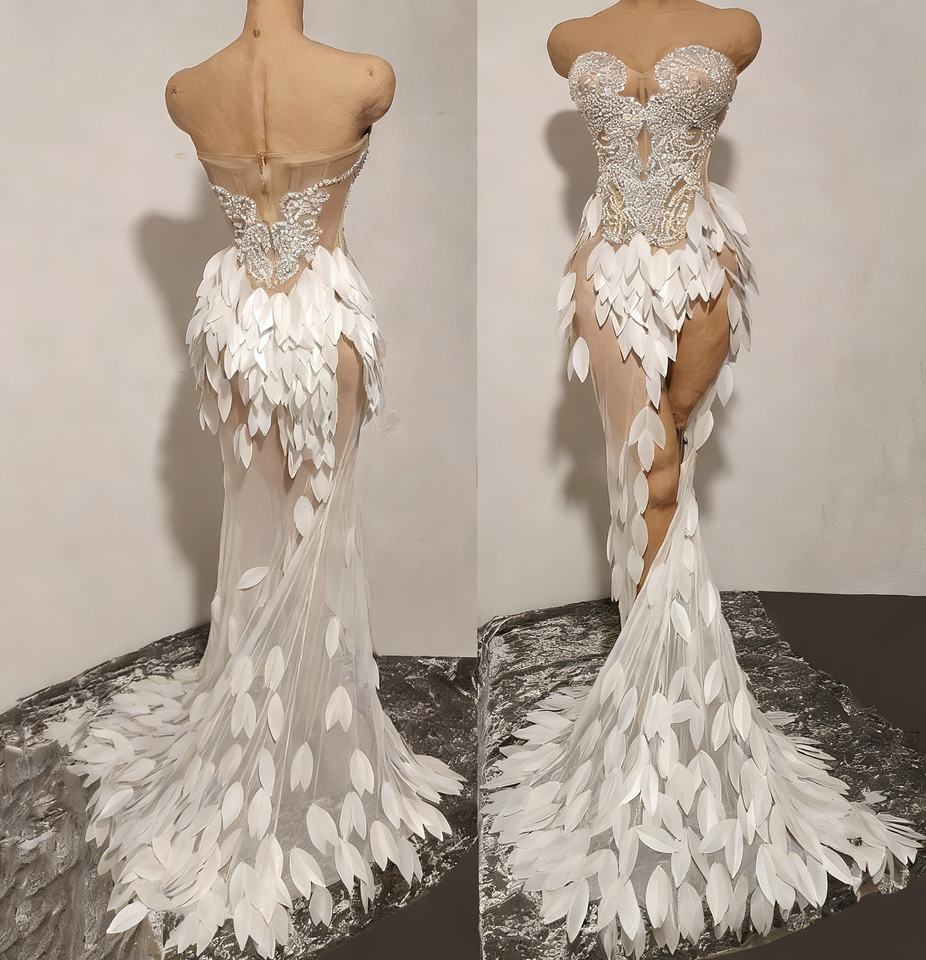 Women's Strapless Pearl Embellished Feather Maxi Dress Sheer Mesh Mermaid Gown with Train Evening Dresses Sehe Fashion