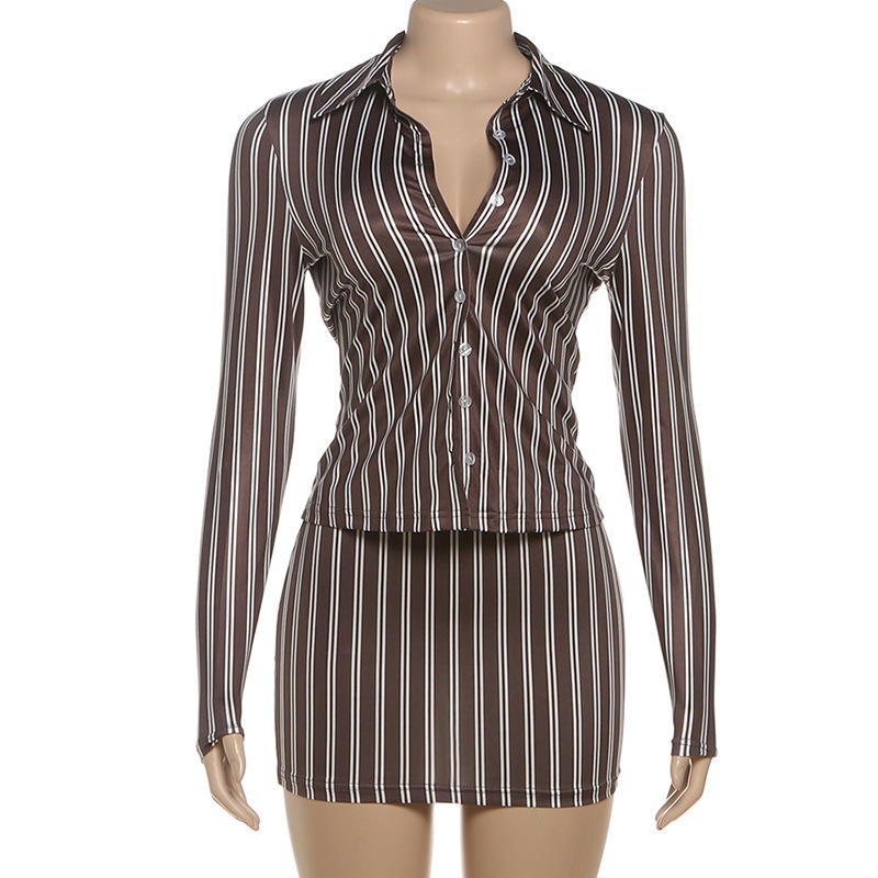 Completo da donna a due pezzi con stampa a righe, camicia e gonna abbinati, outfit da ufficio.