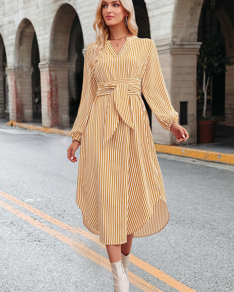 Abito Midi a Righe con Scollo a V per Donna, Maniche Arricciate, Cintura in Vita, Spacco Laterale, Vestito Estivo Casual a Maniche Lunghe per Feste e Uso Quotidiano