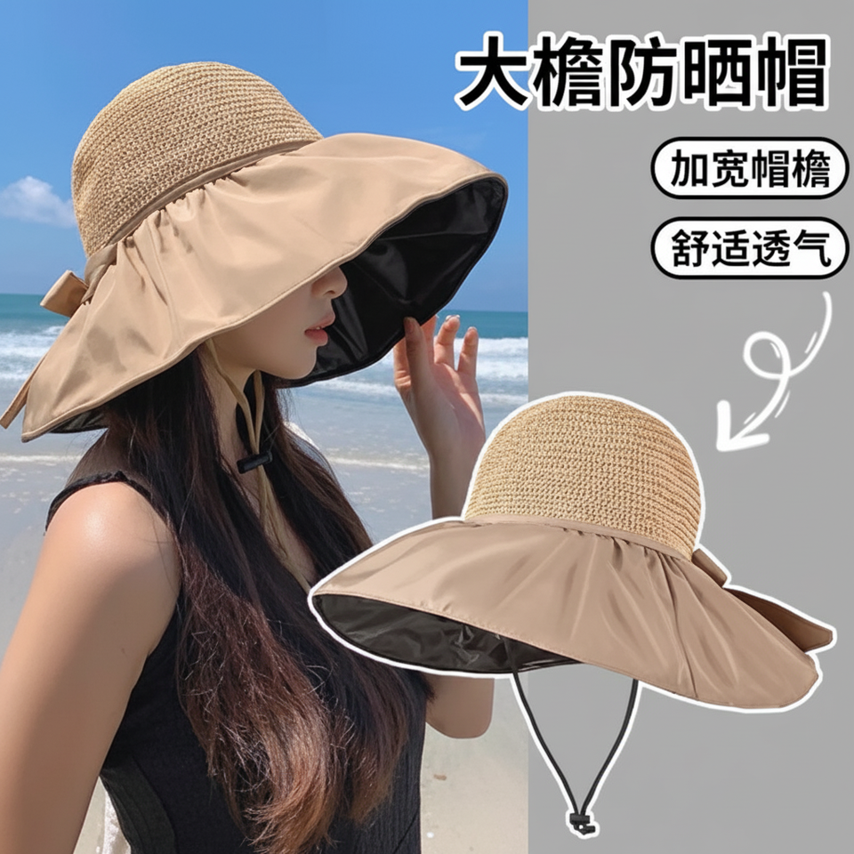 Women's Summer Sun Hat with Big Brim 49mm Black Rubber Beach Hat Hollow Out Straw UV Protective Elegant Black Color