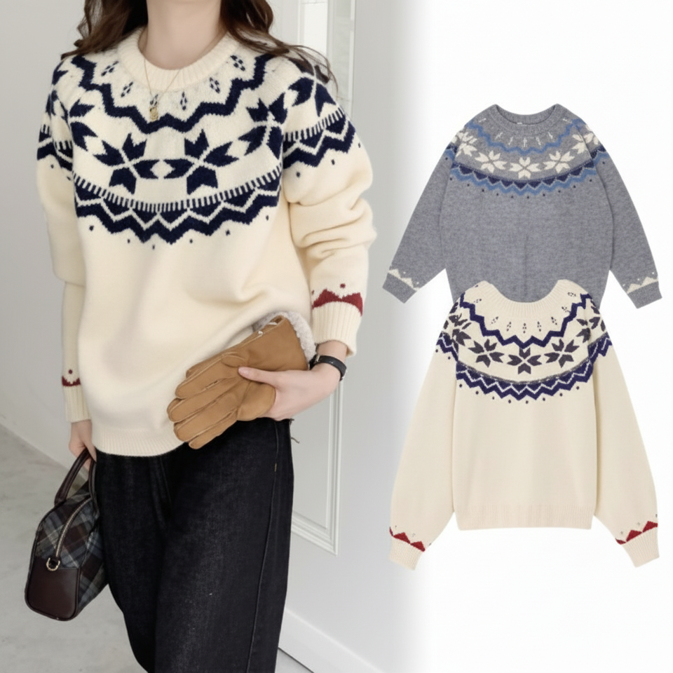 Women's Thick Nordic Pattern Snowflake Knit Sweater T-Shirt for Winter Comfortable Overfit Design