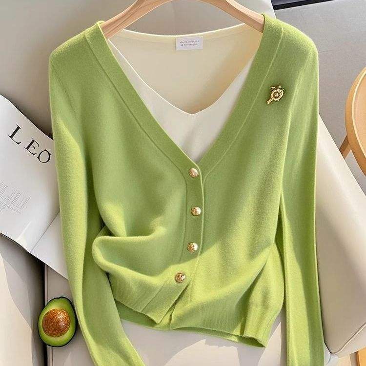 Design Chic unico da donna autunno inverno collo a V verde due pezzi maglia a maniche lunghe Cardigan con Base in maglia stile Casual