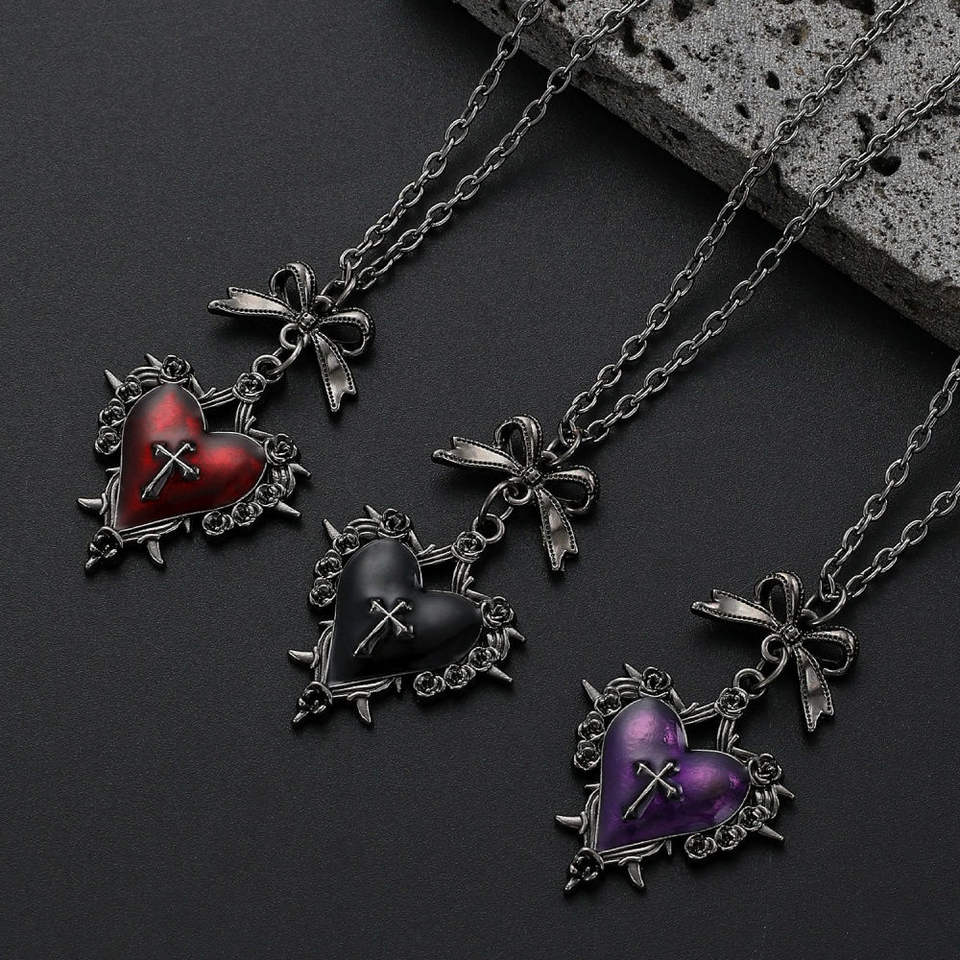 Women's Unique Retro Sweet BowKno Geometric Thorn Cross Heart Pendant Necklace Trendy Zinc Alloy Chains for Party Christian