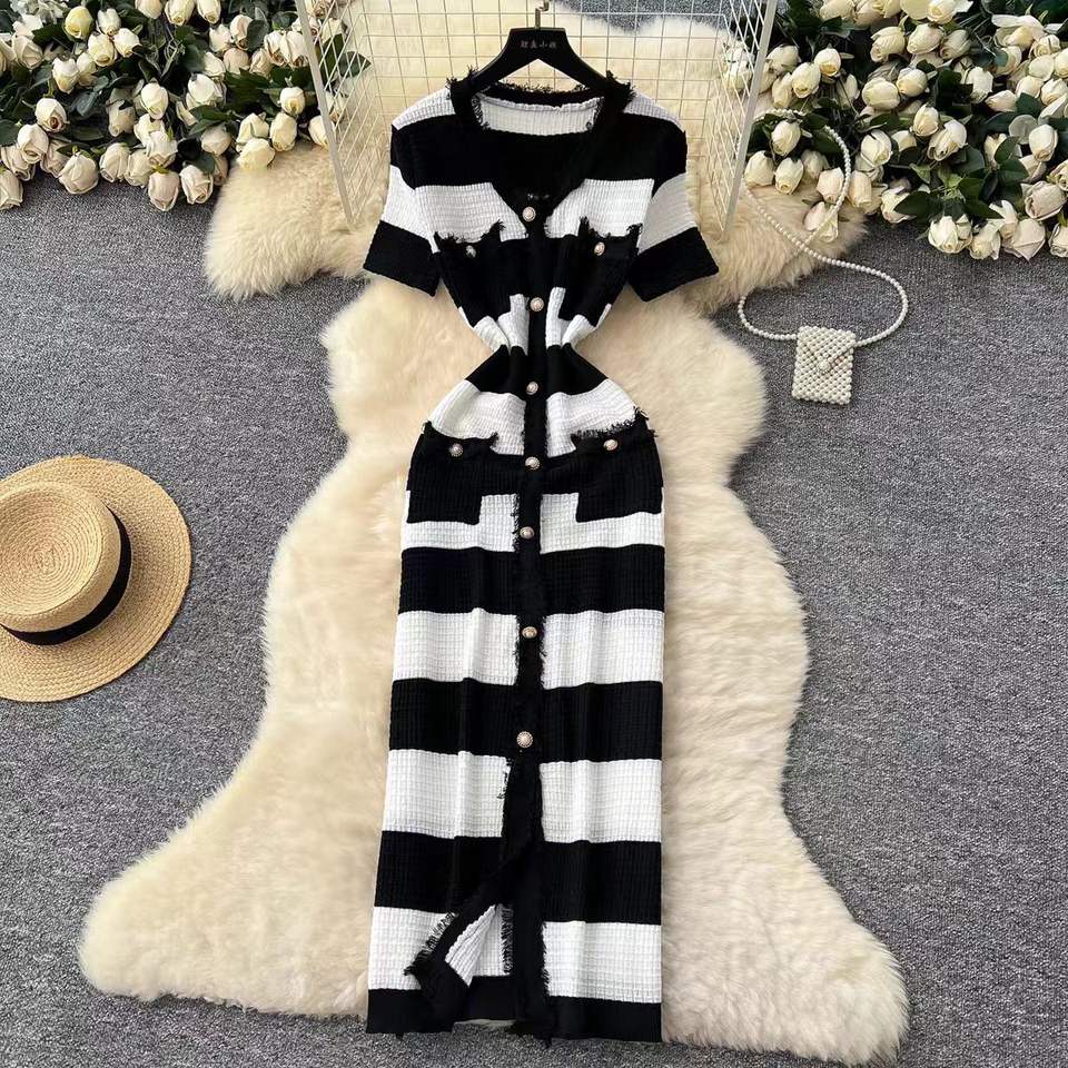 Women's V-neck Short-sleeved Row of Buttons Waisted Temperament Knitted Sweater Dresses Sehe Fashion