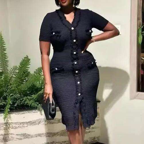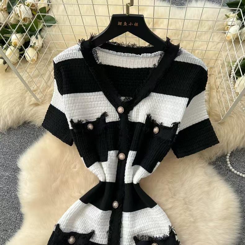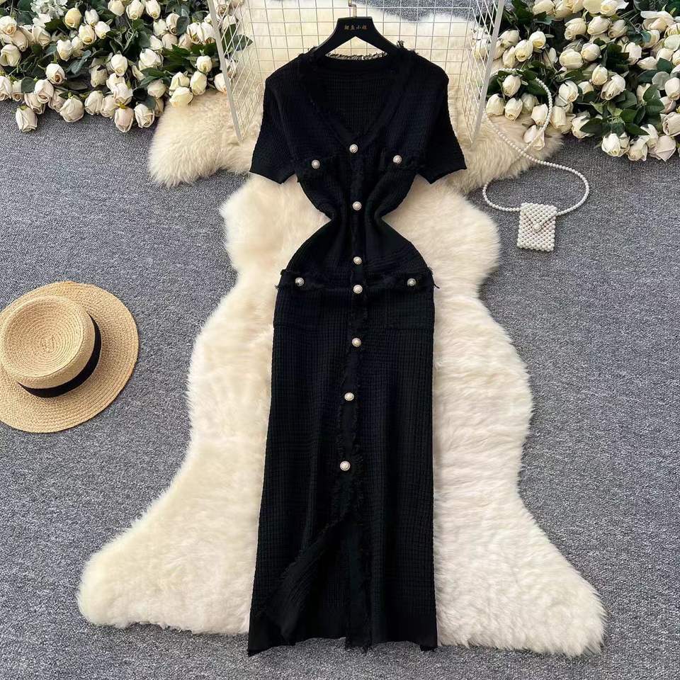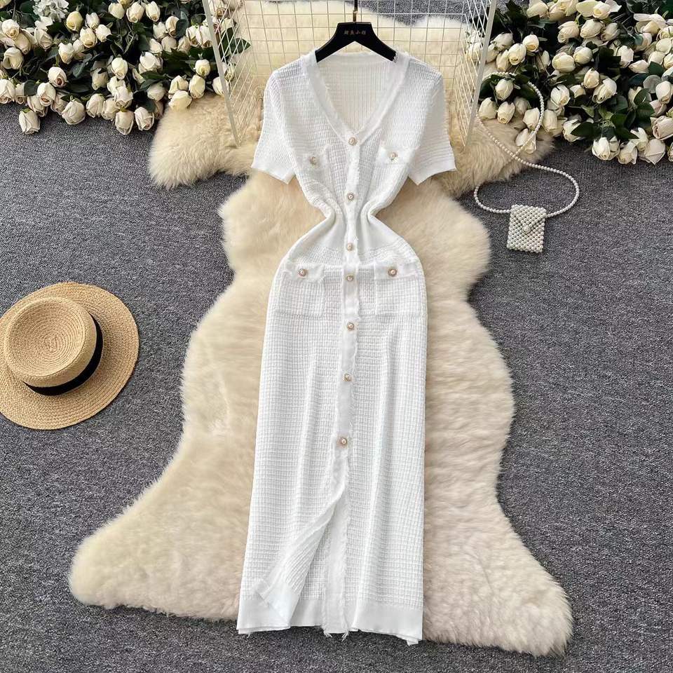 Women's V-neck Short-sleeved Row of Buttons Waisted Temperament Knitted Sweater Dresses