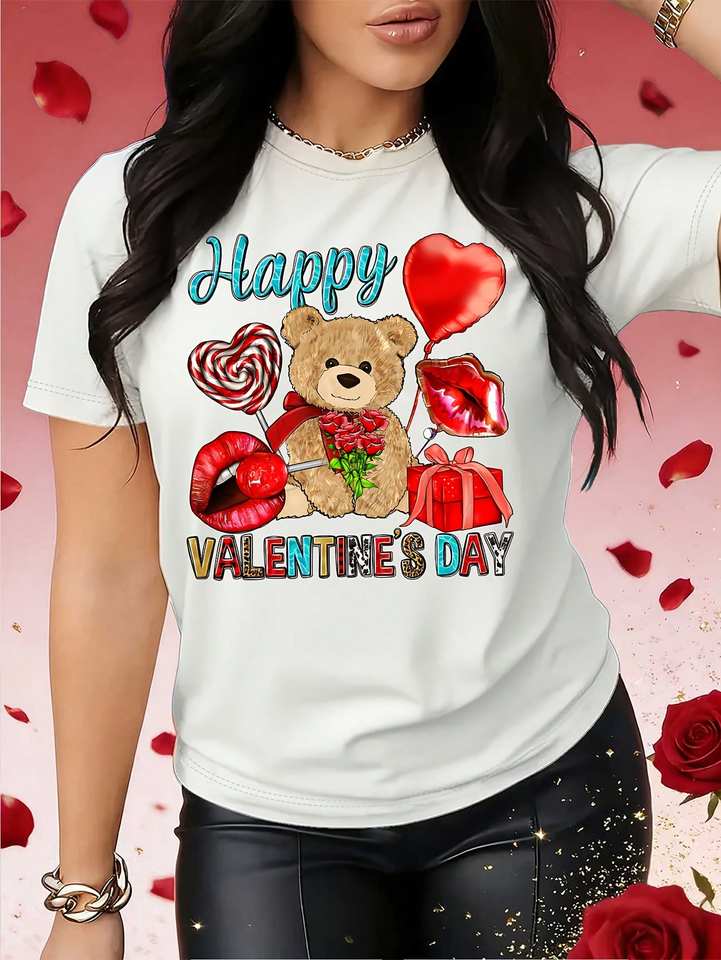 Women's Valentine's Day Bear Heart Print T-Shirt Round Neck Short Sleeve Casual Top 100% Cotton Breathable Spring Summer Wear