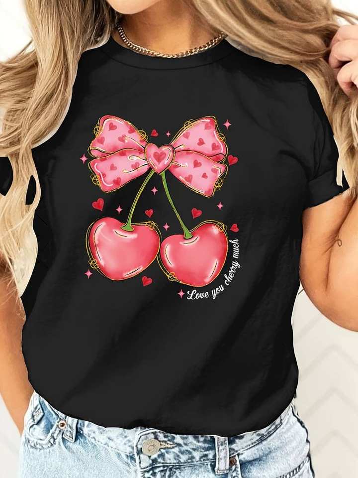 Women's Valentine's Day Printed Short Sleeve T-Shirt With Cherry Bow Design Regular Fit 100% Cotton Jersey Spring Summer Cute