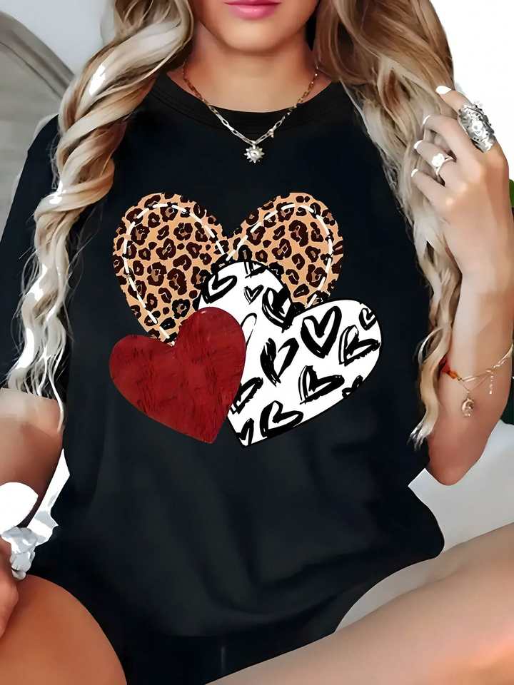 Women's Valentine's Day T-Shirt Short Sleeve Round Neck Leopard Heart Red Glitter Print Casual Loose Fit Spring Summer Top