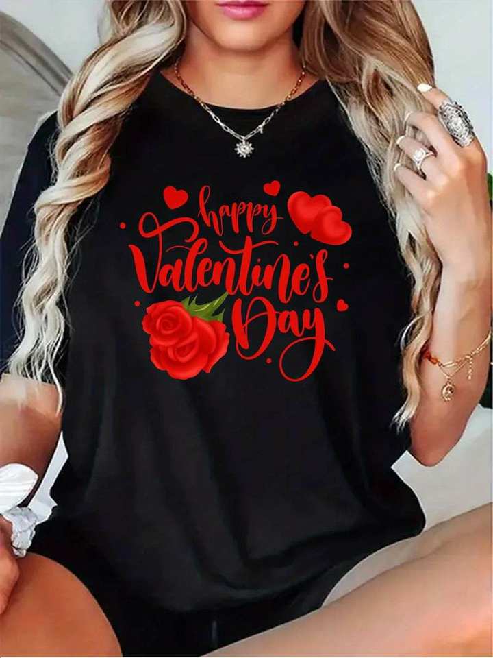 Women's Valentine's Day T-Shirt Short Sleeve Round Neck Casual 100% Cotton Printed With Red Rose And Heart Design