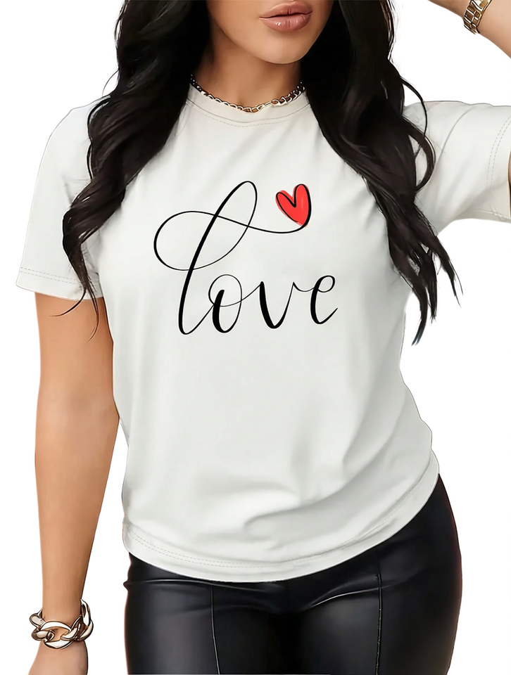 Women's Valentine's Day T-Shirt Round Neck Short Sleeve Handwritten Love Print Casual Top Breathable Cotton Spring Summer Wear