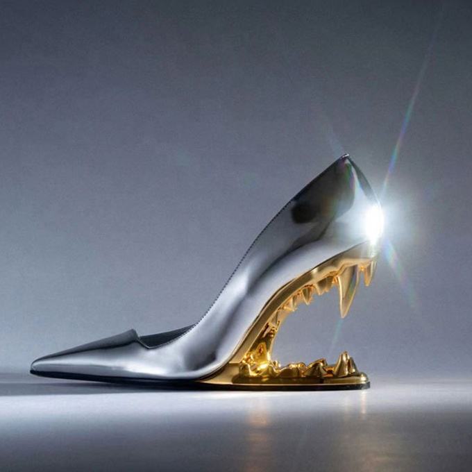 Women's Western Style Pumps Shoes with Tiger Teeth Shape Heel Gold Silver Color Slip-on Fashionable Strange Design for Summer