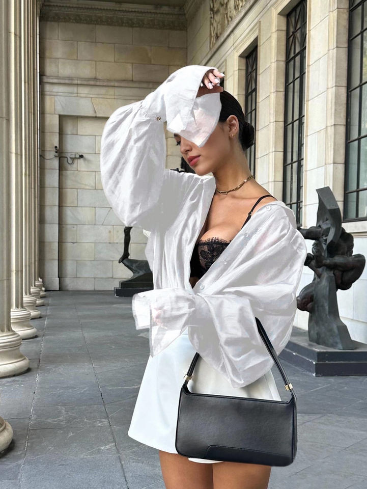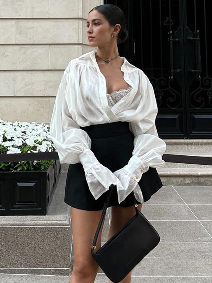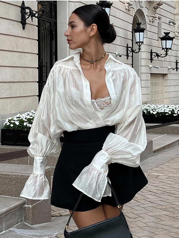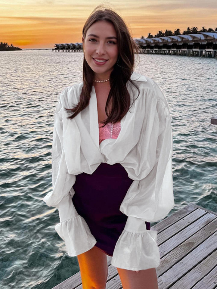 Camicetta Bianca Oversize da Donna con Dettaglio Intrecciato Frontale e Maniche a Sbuffo, Camicia Casual a Maniche Lunghe con Polsini Svasati