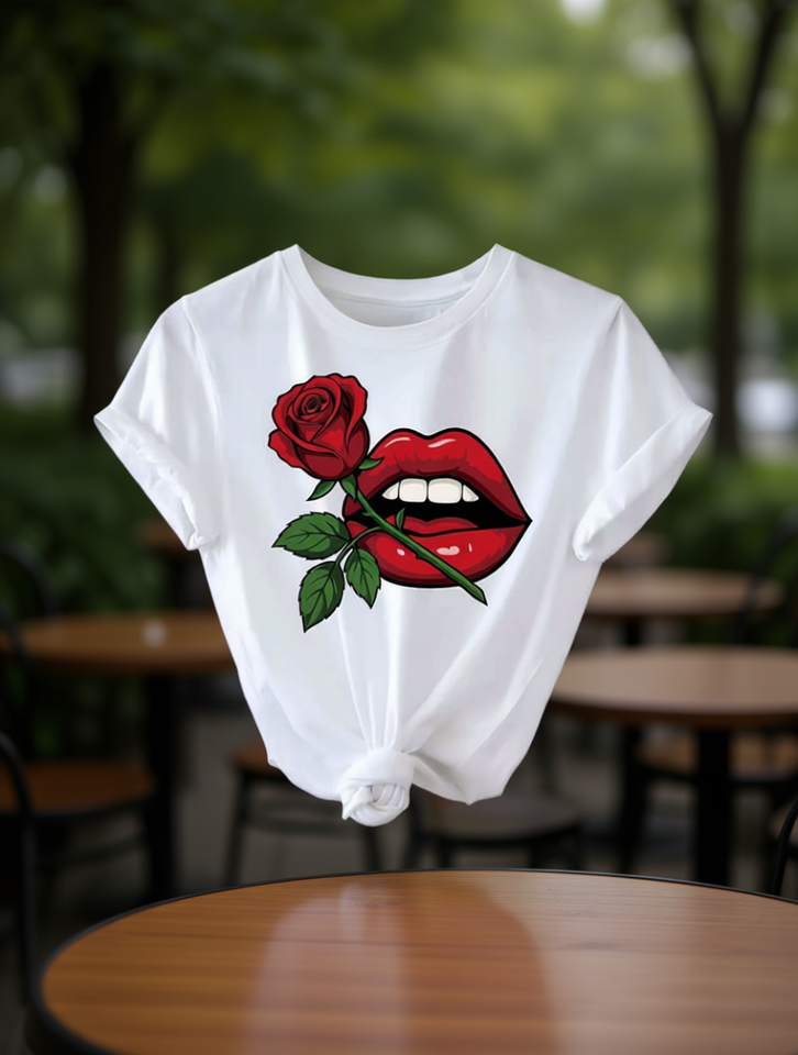 Women's White Short Sleeve Crew Neck T-Shirt Romantic Rose Lips Print Casual Loose Fit All-Season Machine Washable Top