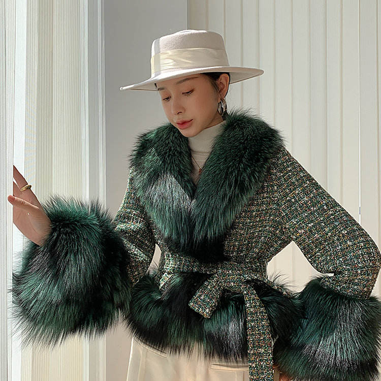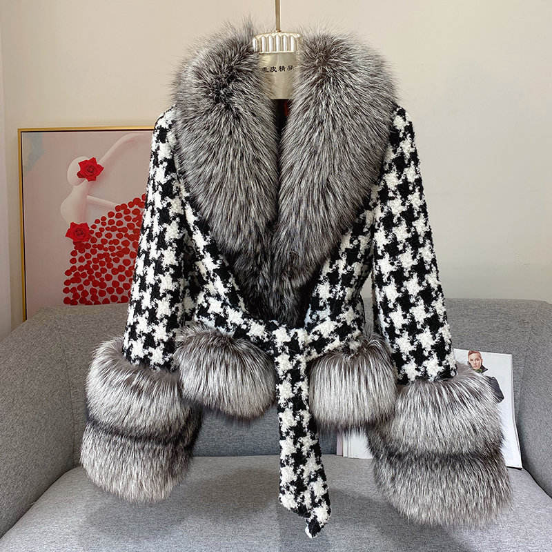 Women's Winter Woolen Blends Coat Huge Fox Fur Collar Cuffs High Collar Long Length Trench Coat Plus Size Print Pattern