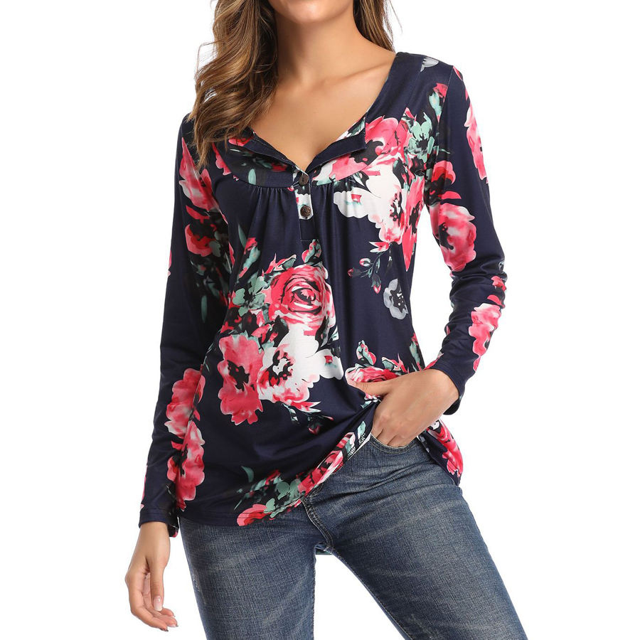 Womens 3/4 Sleeve Girocollo Floreale Tunica Parti Superiori Allentate Camicetta Button Up T-shirt