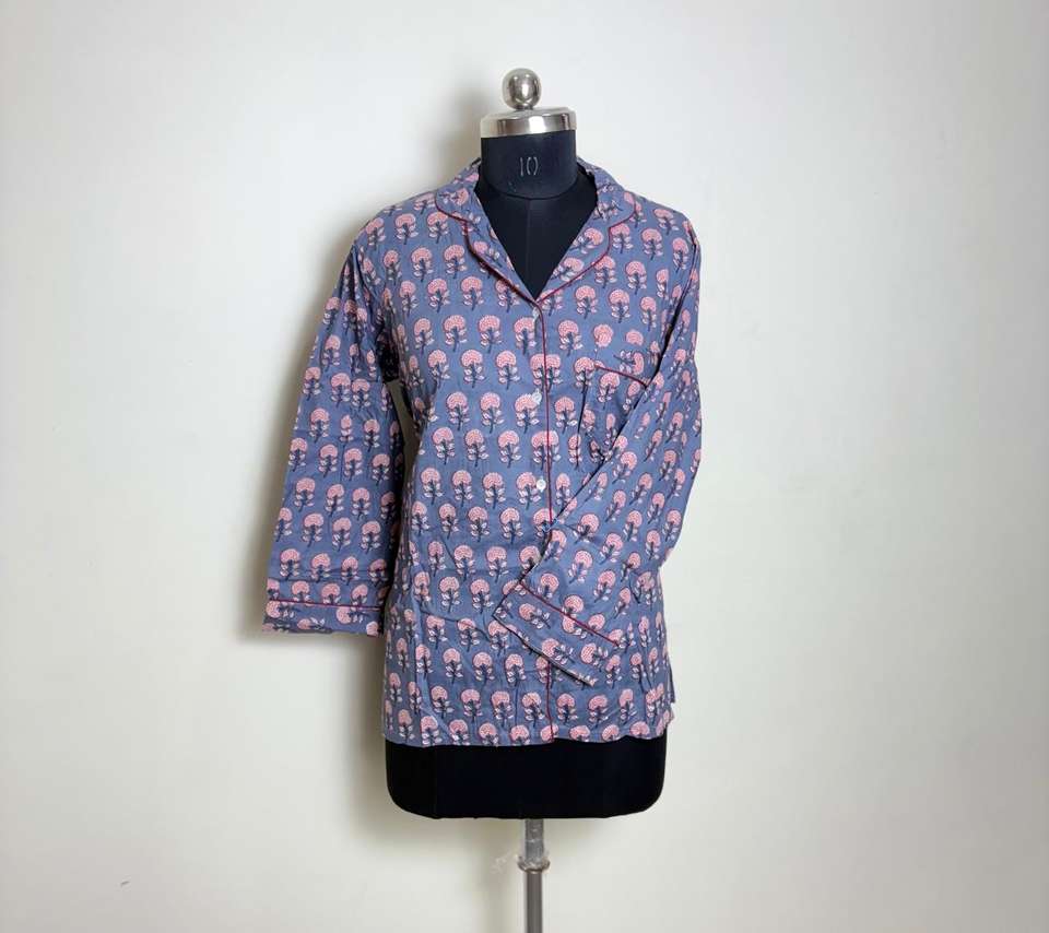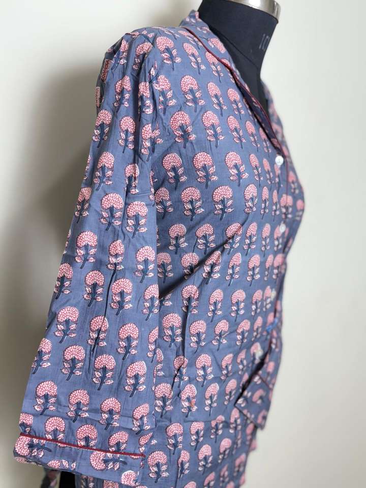 Womens Cotton Printed Nightwear Shirt Blue with Pink Tree Motif