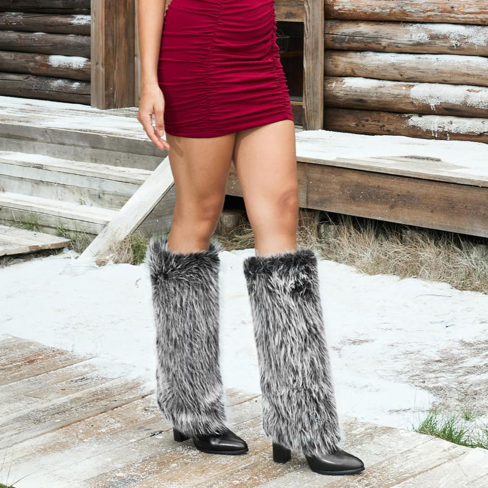 Womens Knee High Fur Heel Boots Furry Fuzzy Fluffy Pointed Toe Boots Tall Long Wide Calf Fold Over Snow Boots with Side Zipper