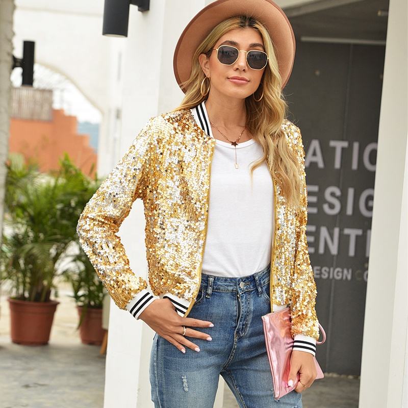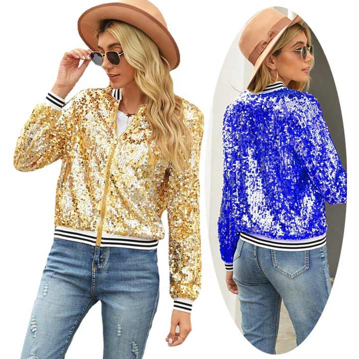 Womens Luxury Jackets Gold Sequin Blazer Glitter Zip up Coat Zipper Baseball Uniform Urban Streetwear Bomber Jacket