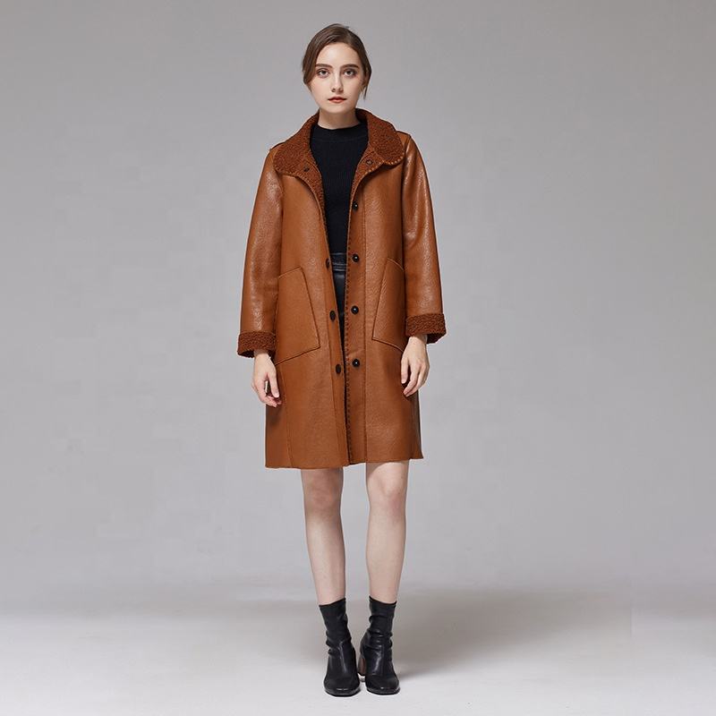 Womens PU Leather Trench Coats Black Oversized Mid Length Jacket Sherpa Lined Overcoat Elegant Clothes Long Coat