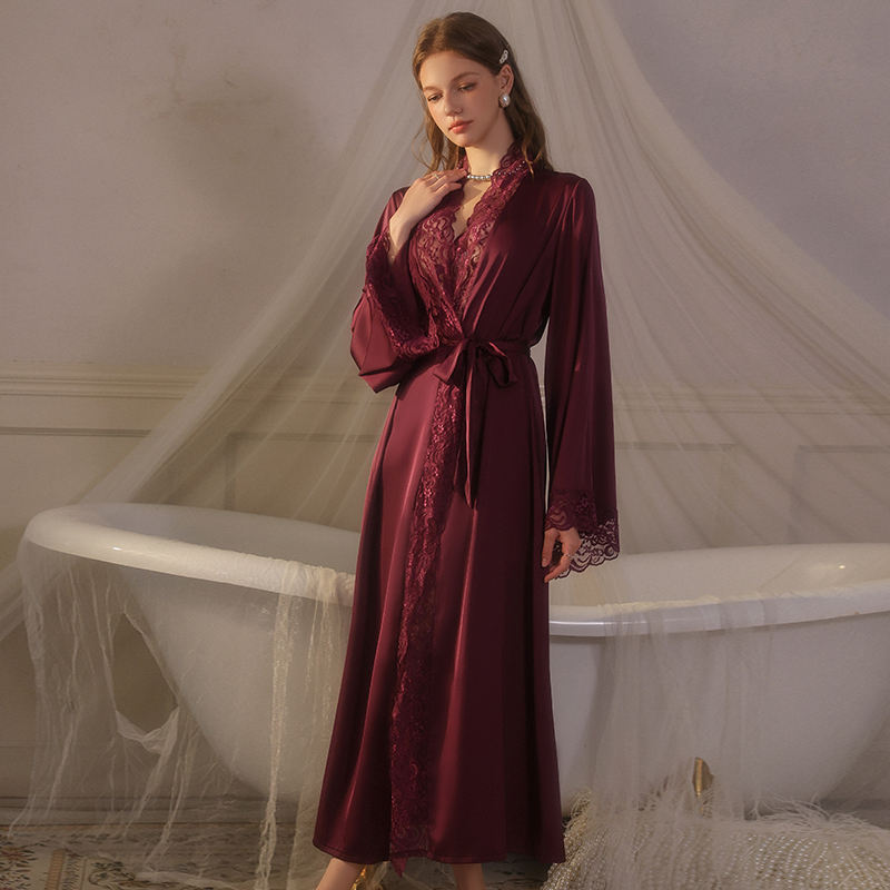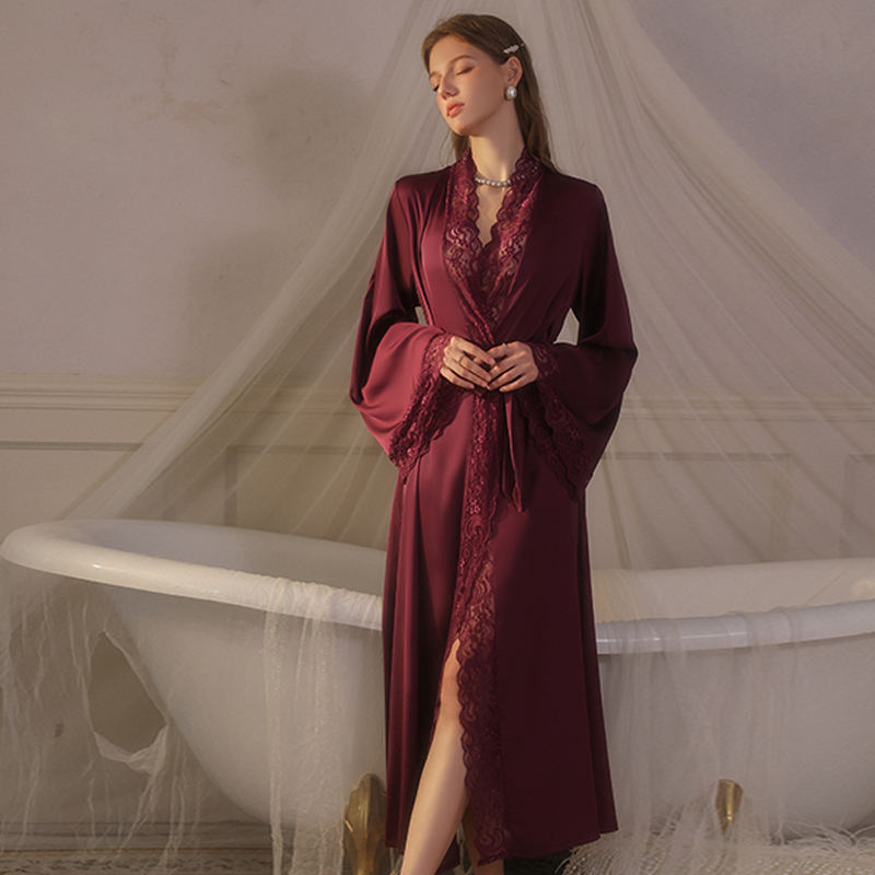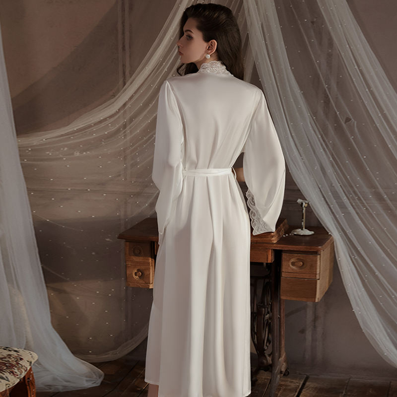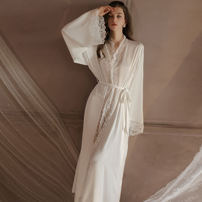 Vestaglia Lunga in Raso con Maniche in Pizzo, Elegante Bianca, Morbida e Lussuosa per Donna