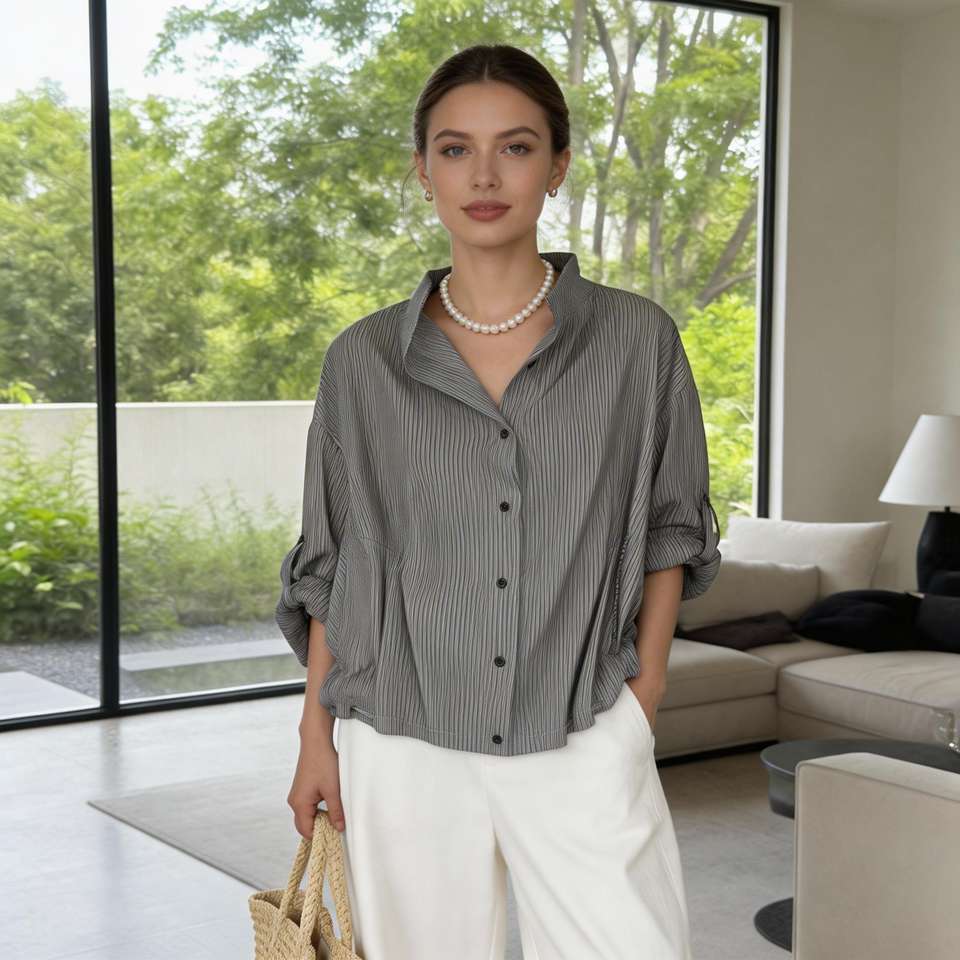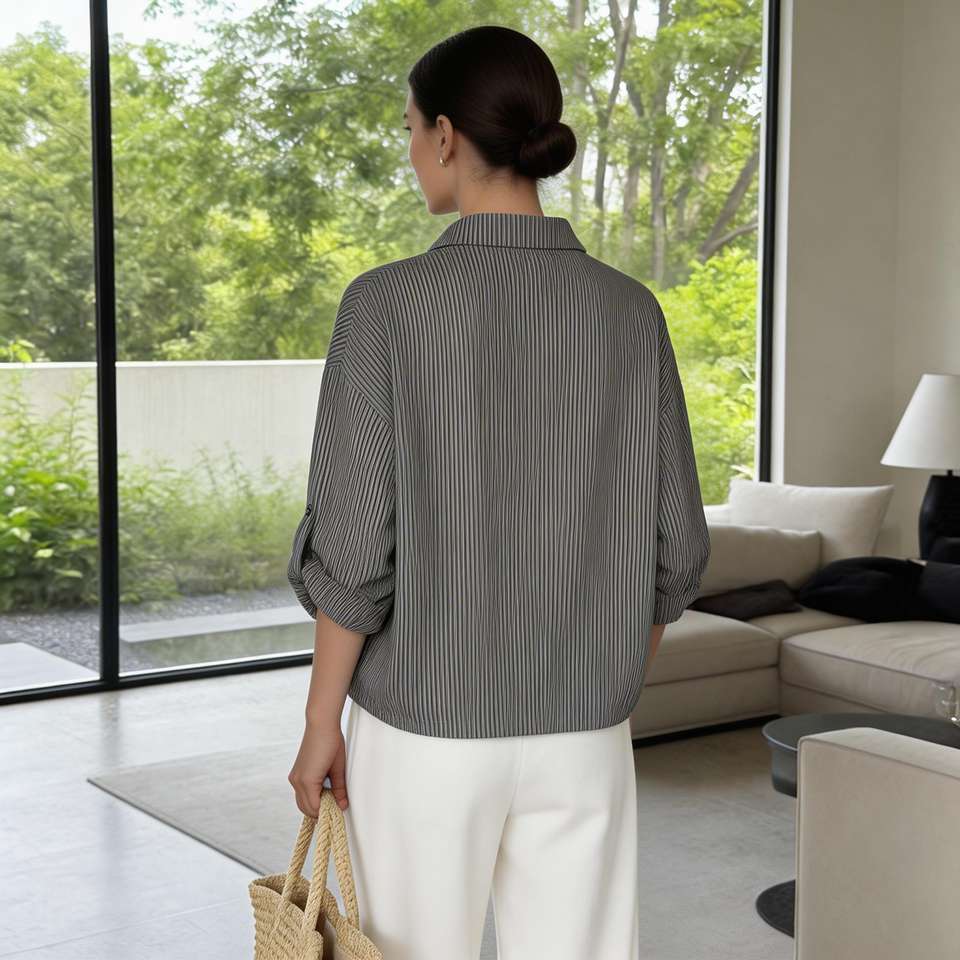 Camicia da donna a righe, vestibilità ampia, morbida, leggera, casual, con colletto alla coreana, maniche a 3/4, con bottoni