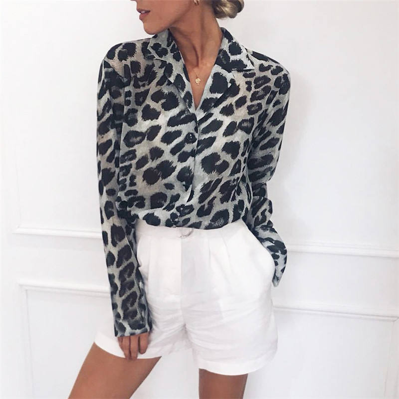 Delle donne di Girare Giù Il Collare Della Signora Ufficio Camicia Tunica Casuale Chiffon Manica Lunga Della Stampa Del Leopardo Camicetta