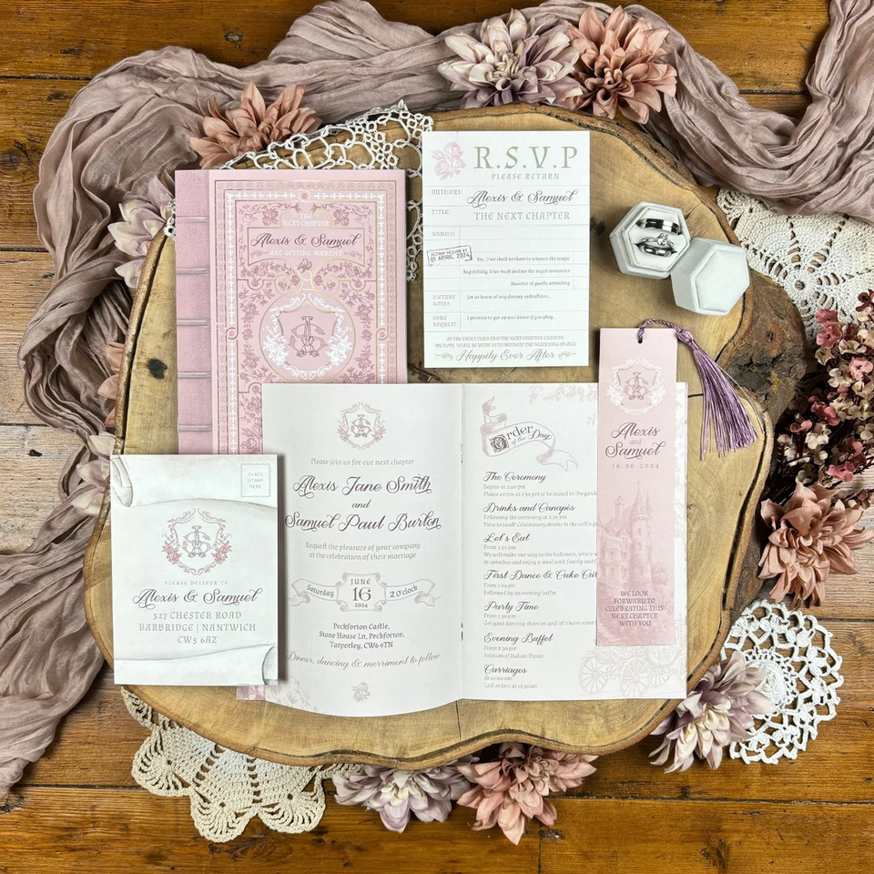 Invito Matrimoniale Stile Libro Pieghevole A5 con Biglietto di Ritorno A6, Libretto Vintage e Segnalibro