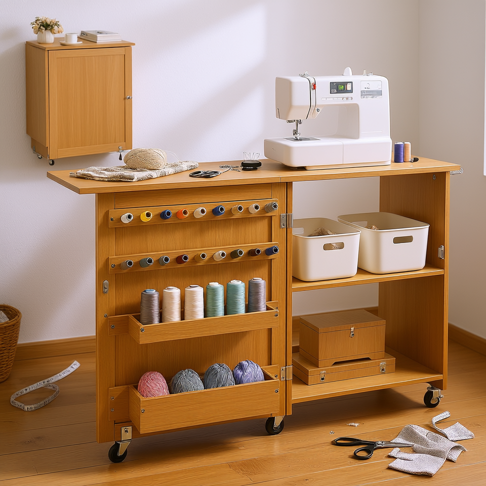 Burlywood Folding Sewing Table With Storage Shelves And Lockable Wheels Portable Sewing Supplies Organizer