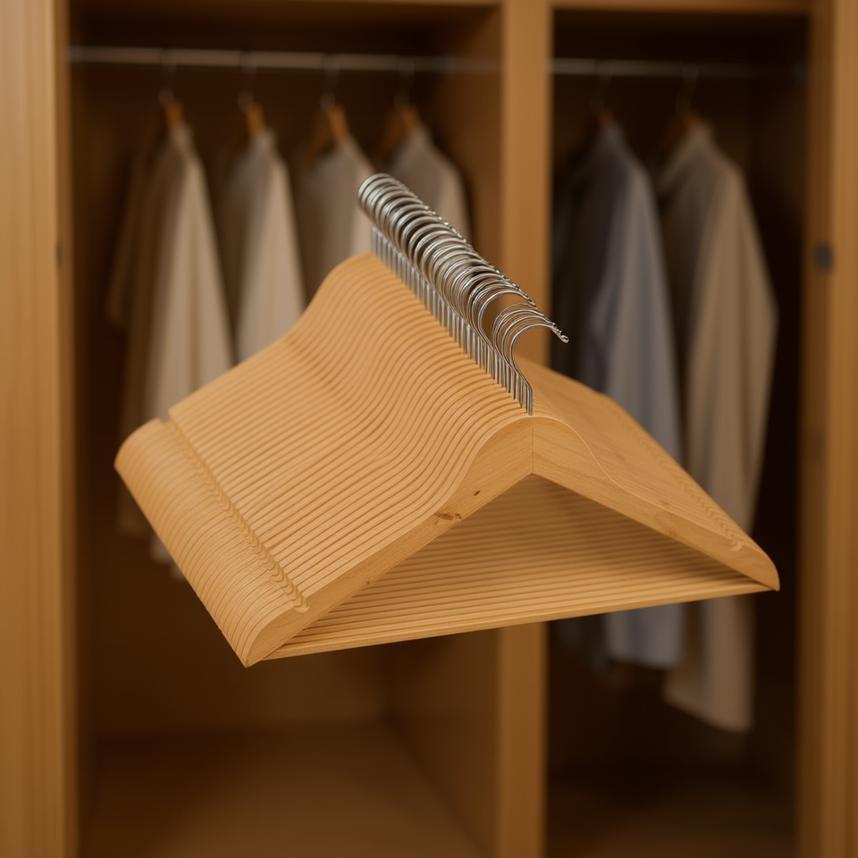Set di 50 appendiabiti in legno di colore marrone chiaro con ganci metallici girevoli per l'organizzazione dell'armadio