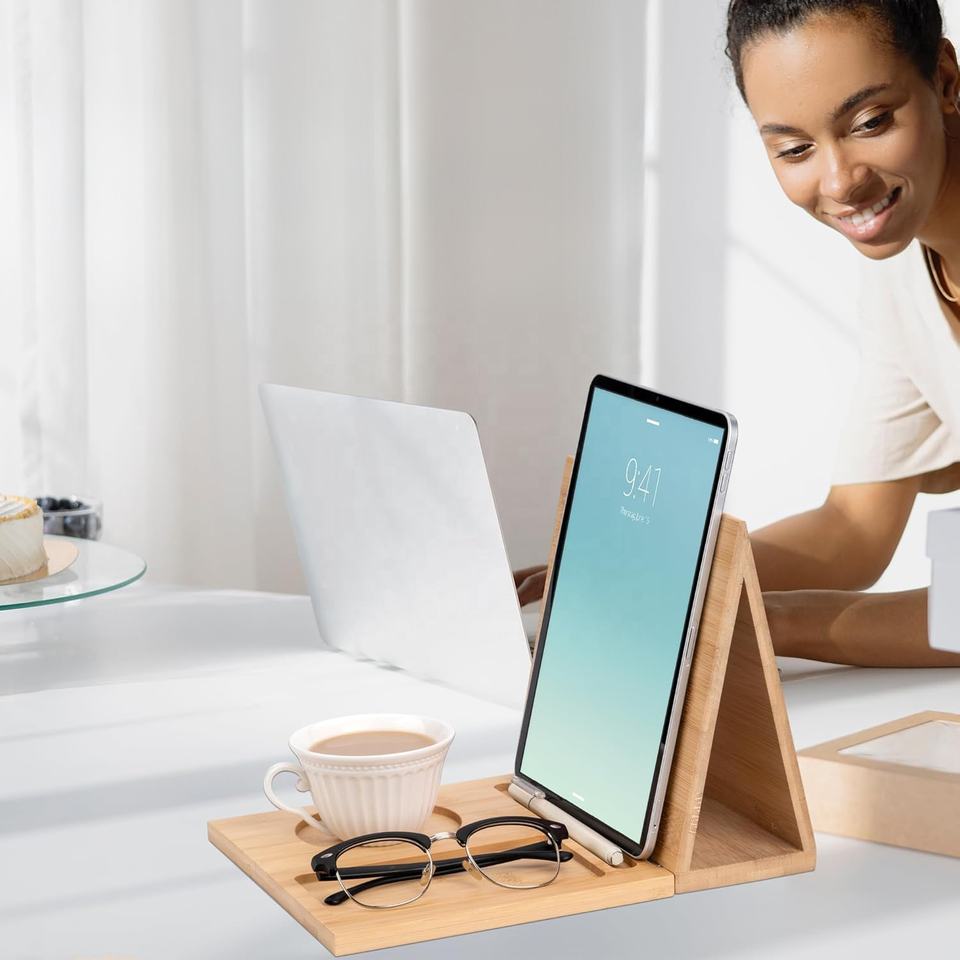 Supporto per Libri in Legno con Portabicchiere e Porta iPad per Comodino e Scrivania, Naturale
