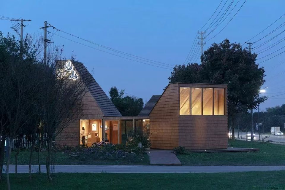 Biblioteca della comunità in legno con tetto Multi-timpano e vetro-legno Design centro culturale casa per uso comunitario